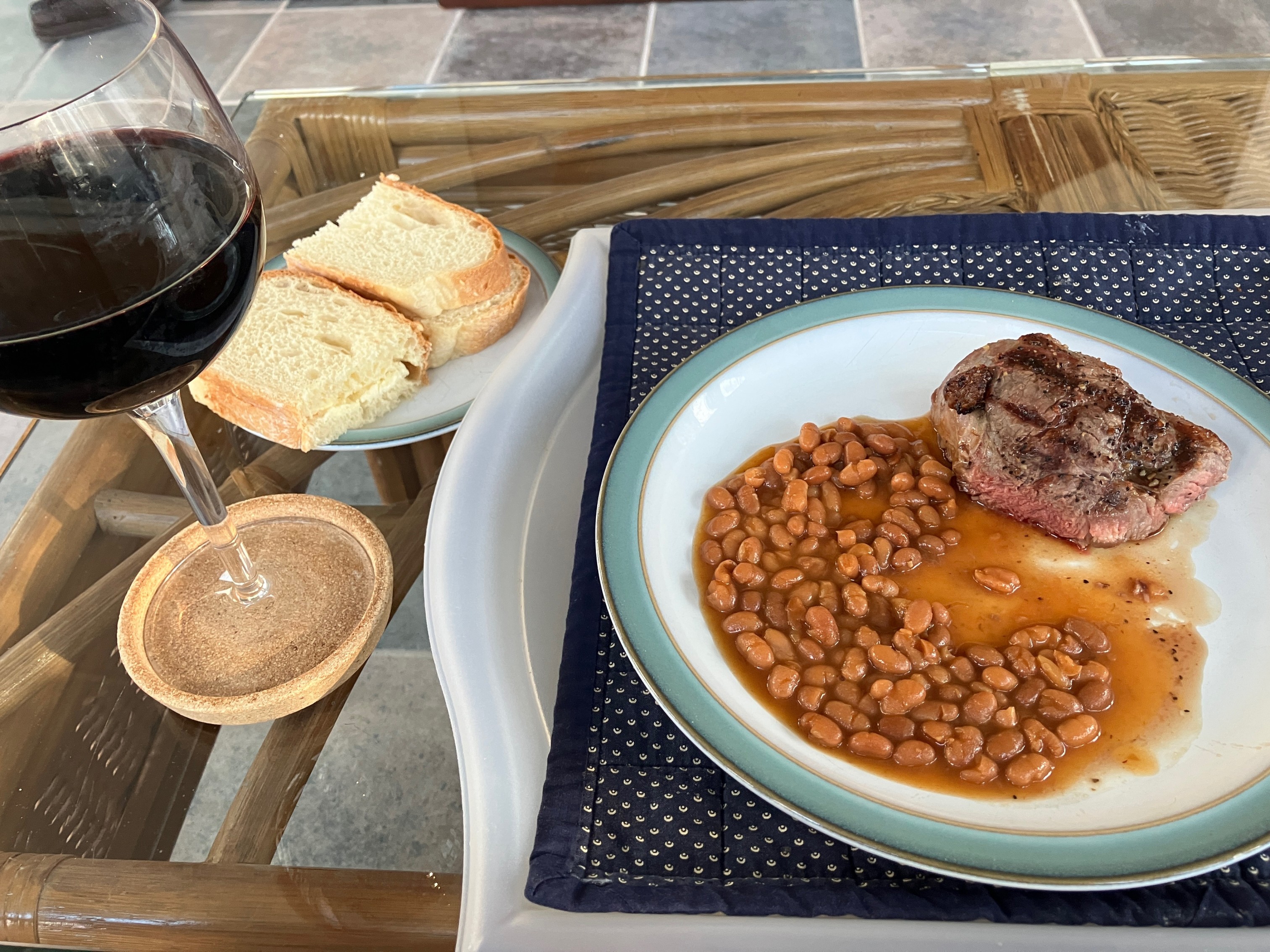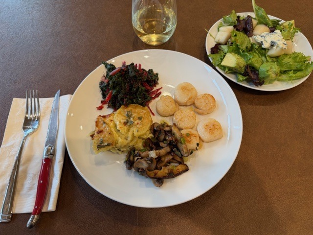 Scallops, au gratin potatoes, shiitake mushrooms and rainbow chard. Plus salad and a glass of Sauvignon Blanc.