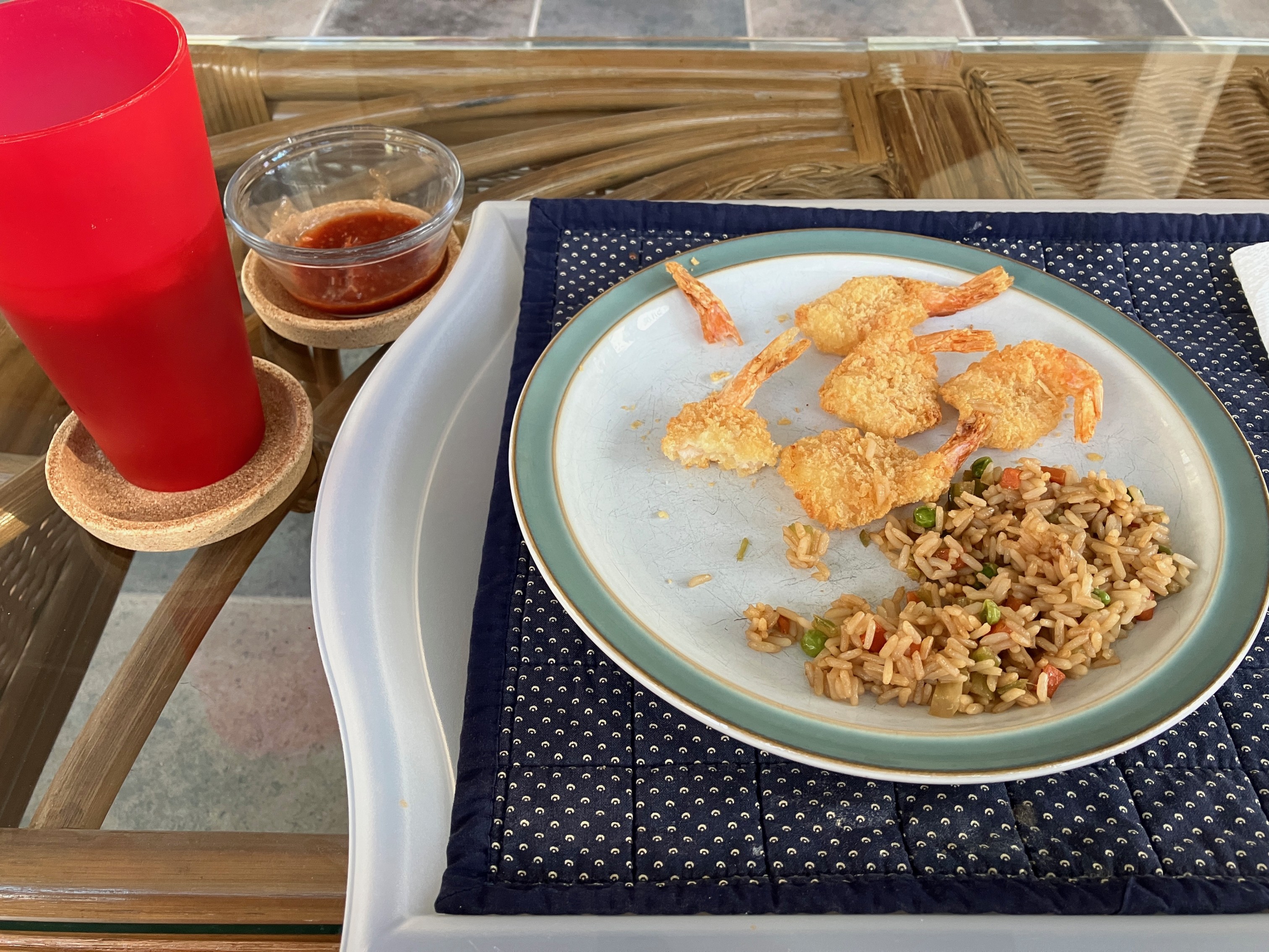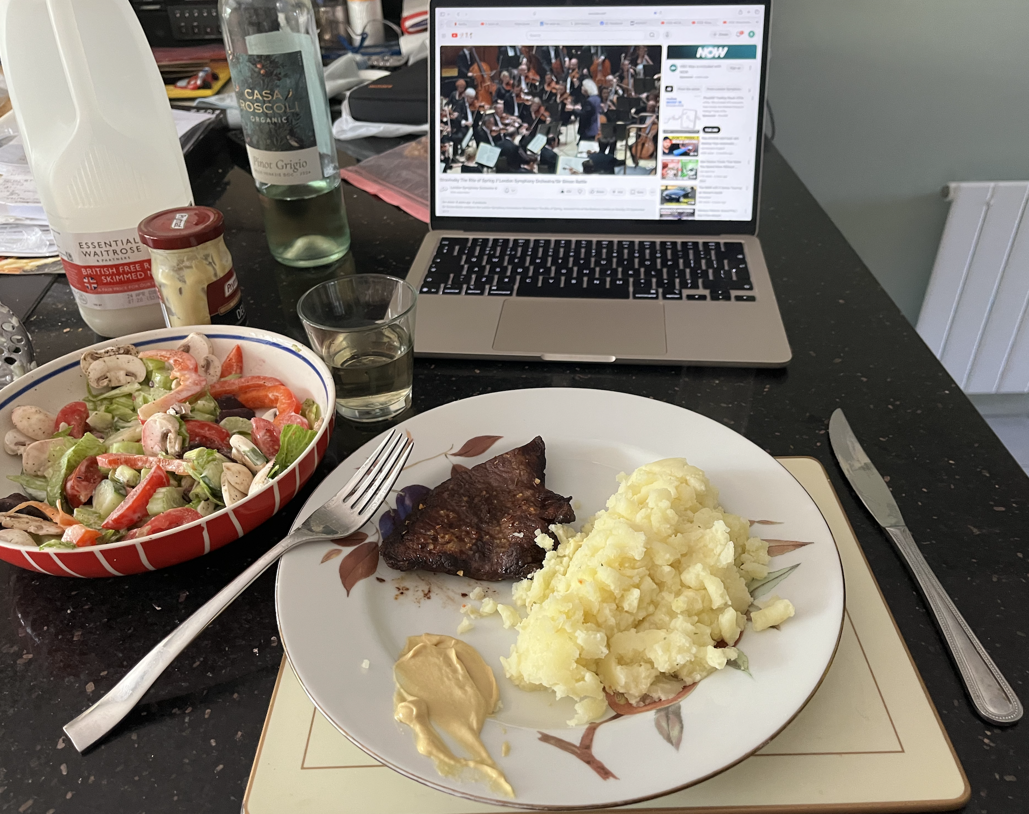 Garlic chicken in crumbs with boiled veg and again King Edwards mash with a glass or two of Pinot Grigio.