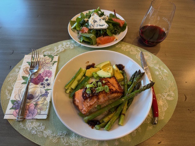 Pan grilled salmon with avocado, veggies, and a mixed green salad w/St. Agar cheese and Cara Cara orange. Paired with Cotes-du-Rhone.