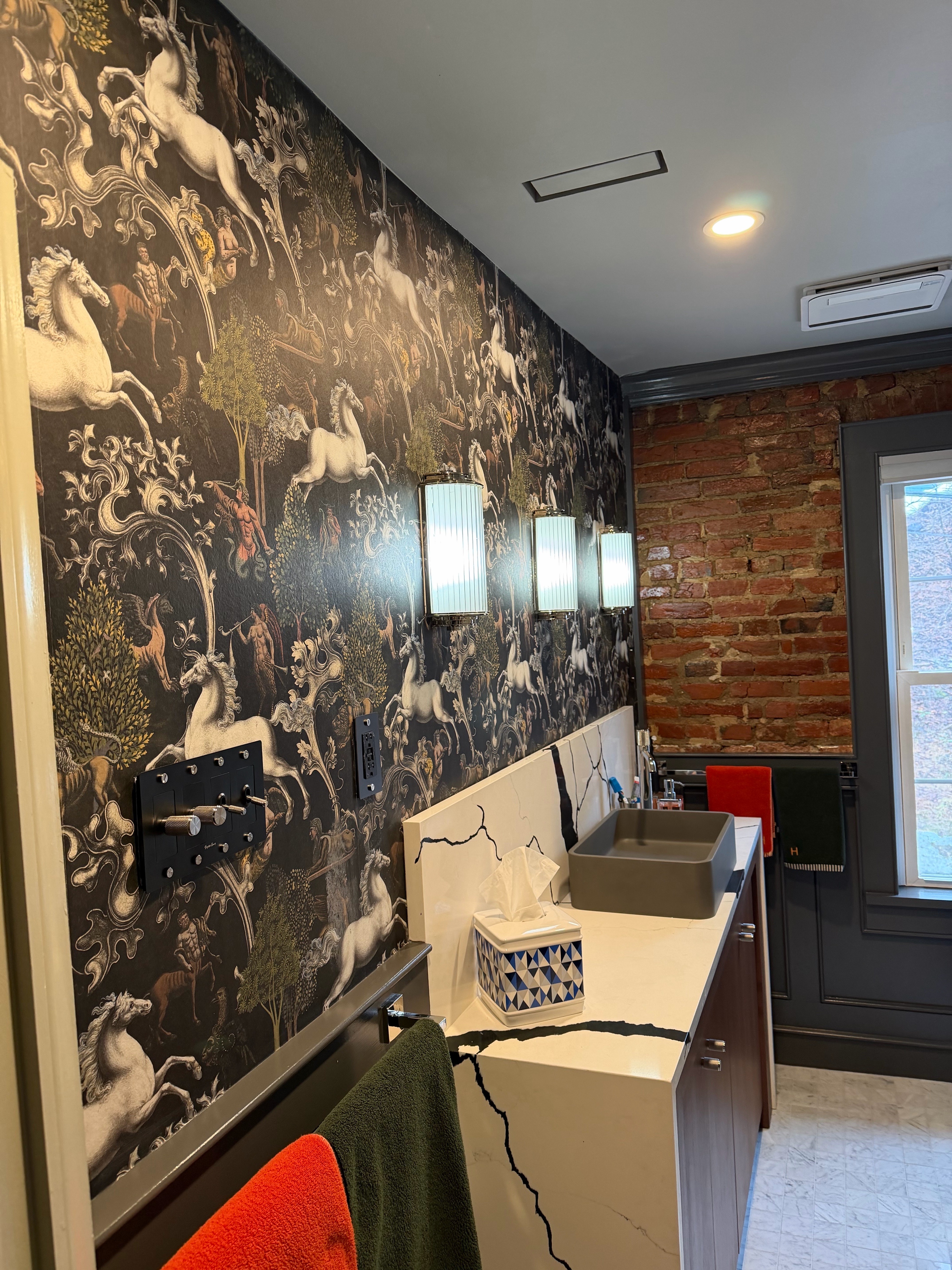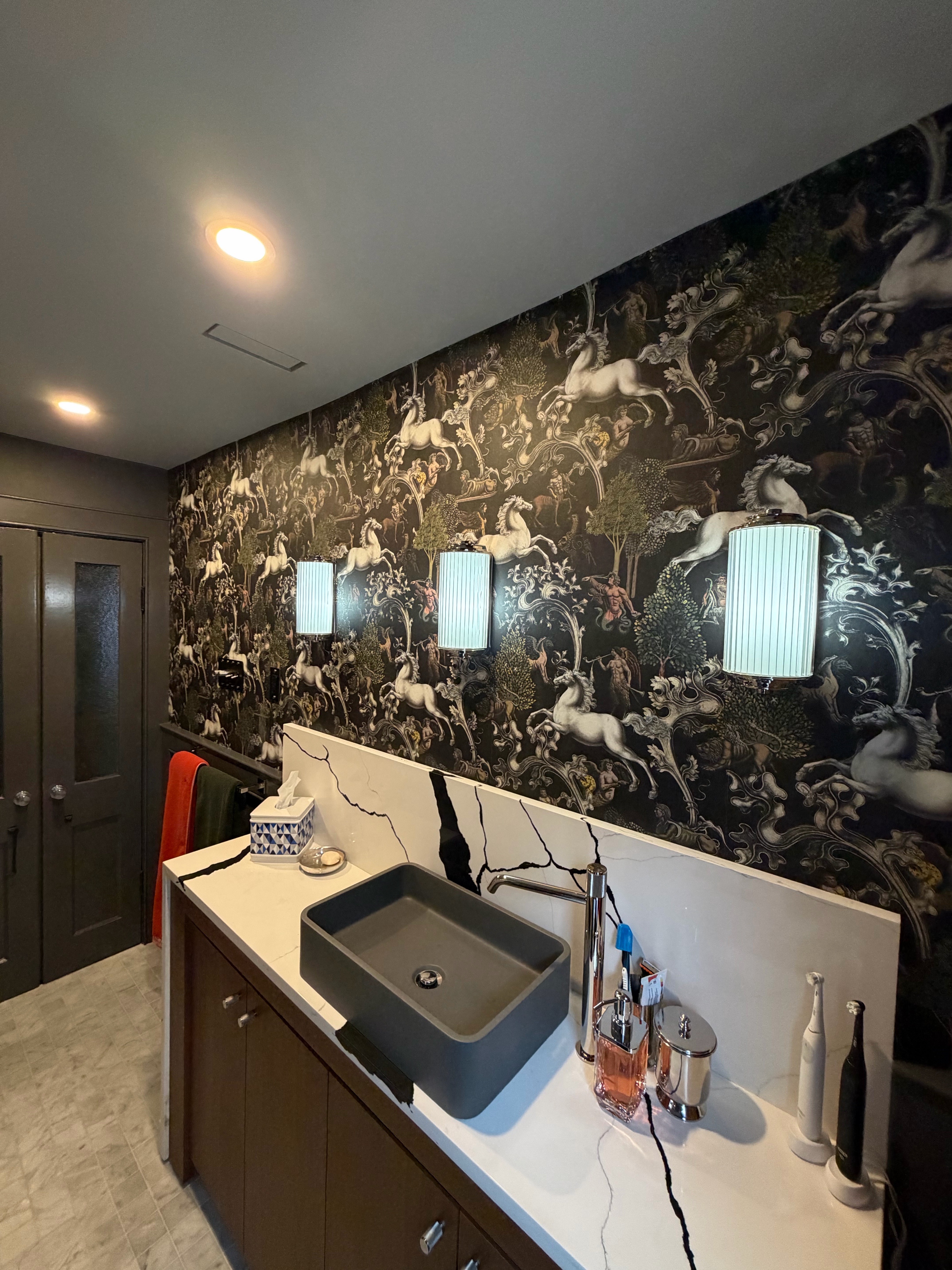 Wallpaper has always been out of my wheelhouse but I thought I’d tackle it myself, I just want to be finished with this dark moody bathroom. Although I had a lot more waste than someone experienced, it came out straight and with perfectly matching seams and no bubbles at all. Shower glass and mirrors come on Tuesday and don’t have to wait for April to be 100%finished Last edited by wrickem; 03-09-2026 at 12:30 PM.. |