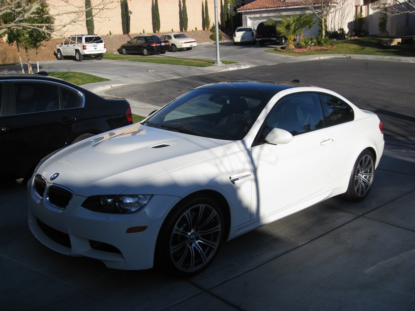 I can't even believe my luck! So here's the story. I had to go out of town to put my deposit down way back in December of 2006, because the salesman at Desert BMW of Las Vegas told me to expect to pay at least 10,000 over MSRP. Needless to say, I had a serious problem with that. So I became number 14 on the list at BMW of San Diego with a guarantee to sell at MSRP. On Friday morning I called BMW SD, and they told me to expect MAYBE an August delivery. Being that is was the day before official launch, I stopped by Desert BMW of Las Vegas just to see if maybe they would let me look at some lucky guy's new M3 in the back lot before it was delivered. I walked up to the first salesman I found and asked him if he had any M3's I might be able to look at. He smiled and pointed. "Right around the corner of the building sits an e92 AW 6 speed with carbon fiber roof and loaded with every single option. It has been sitting there for 30 minutes and it is available at MSRP." HOLY CRAP!! I got it. I have the first one in Nevada! I spent the entire night driving up the strip and around town. As far as first impressions go, I LOVE this car. The steering is a bit light even in sport mode compared to my e90 330i. Not a deal breaker though. Nothing will prepare you for the sound. It makes people within 500 feet stop and stare. Here are the first pics from this morning. If any of you guys are in Vegas, I'd be happy to give a demo!