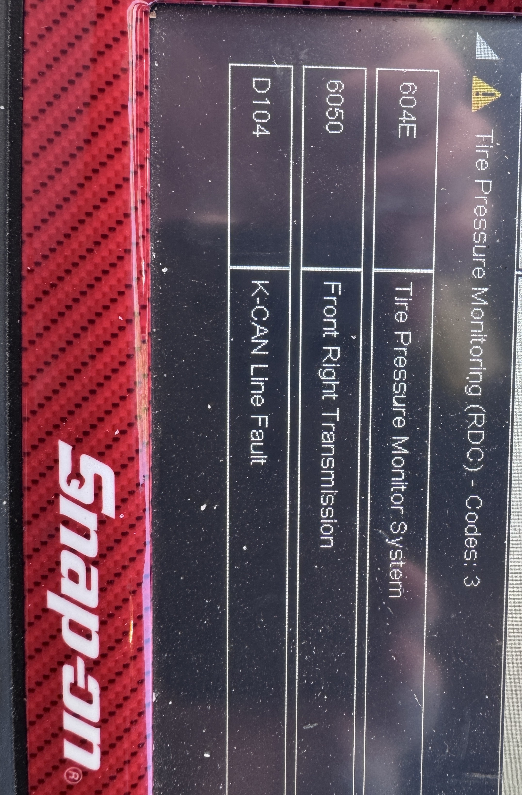 604E tire pressure monitor system 6050 front right transmission D105 K-CAN line fault I can clear them and they immediately come back. These are the same codes that were on it originally, nothing changed after installing the pigtail and trigger module. Furthermore I do have a snap on TPMS4 too and all the sensors in the tires are reading. So I know it's not an issue with the sensor in the tire. |