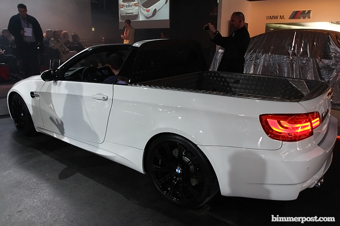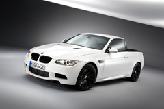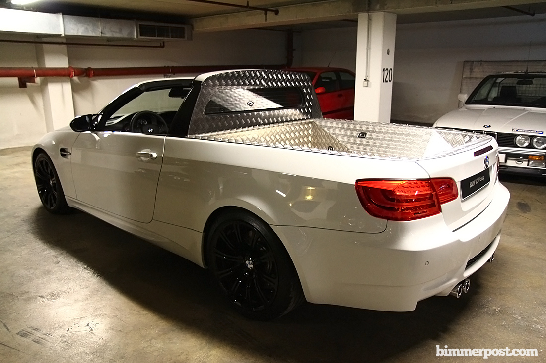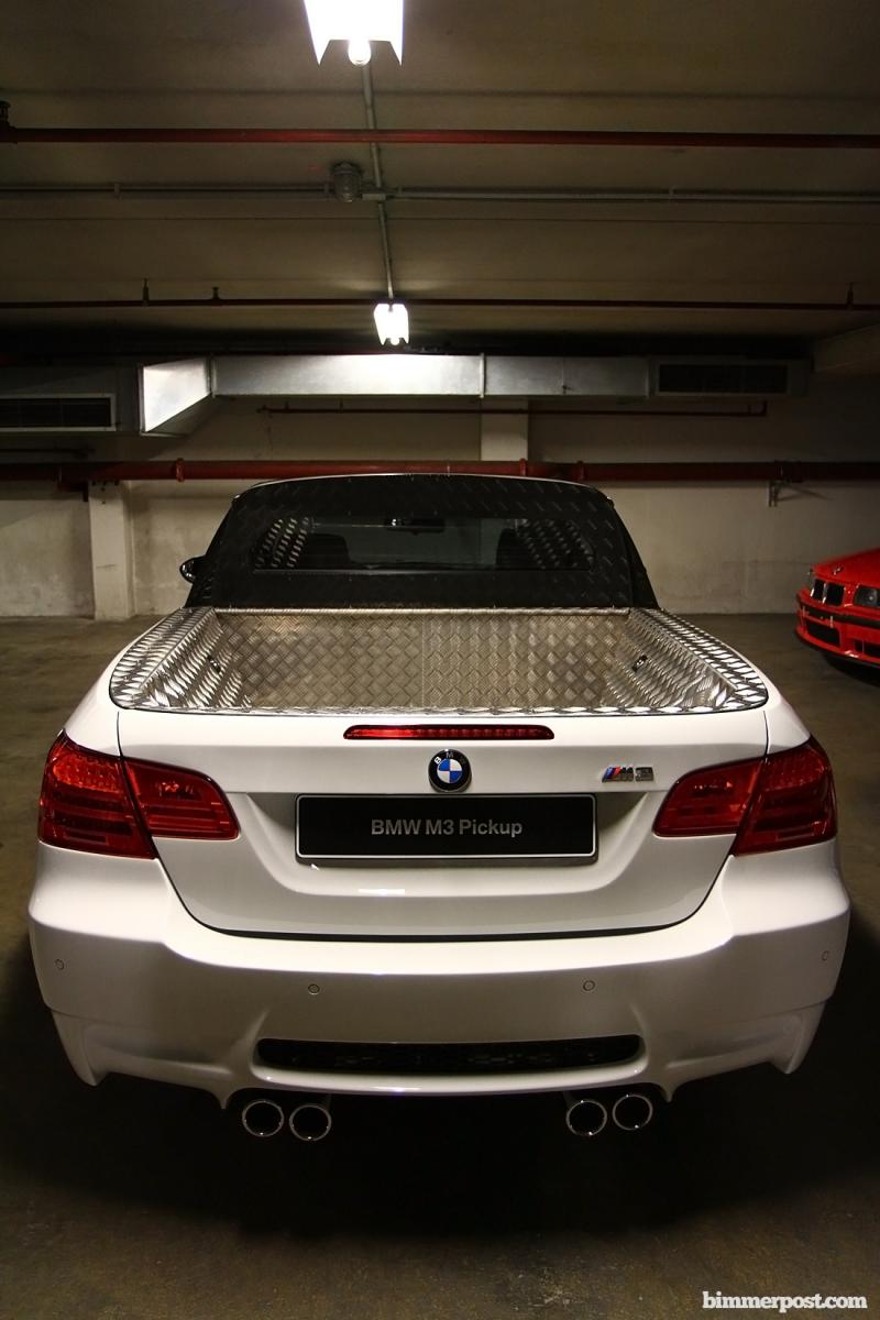 BIMMERPOST NEWSOfficial pictures of the BMW M3 Pickup break cover Unique: BMW M GmbH develops the world’s fastest pickup. Drive and suspension technology from the BMW M3 – comprehensive testing completed on the Nürburgring-Nordschleife – 420 hp and 450 kg load capacity – world premiere on 1 April 2011. Munich. Following the BMW M3 Coupé, BMW M3 Convertible and BMW M3 Sedan, a fourth body variant of this globally successful high-performance sports car is about to cause a stir. Under the strictest secrecy, the world’s first high-performance pickup has been created at the BMW M GmbH development centre. The sportiest example by far in this vehicle category, the BMW M3 Pickup will fire the imaginations of all motorists with a deep appreciation of top performance matched by a keen practical bent. 309 kW/420 hp under the bonnet and a rear-axle load capacity of up to 450 kilos take the hallmark BMW M relationship between race-oriented driving pleasure and everyday utility to an entirely new level. This unique vehicle has already completed extensive test and set-up drives on the Nürburgring’s Nordschleife in advance of its global unveiling on 1 April 2011. With this vehicle, BMW M GmbH once again furnishes evidence of its exceptional competence in developing and building high-grade, individual dream cars. With a high-revving V8 engine at the front, a generously sized load area behind and a removable Targa roof above, driver and passengers in the BMW M3 Pickup will relish an unprecedented take on the familiar M feeling. Yet this spectacular new development is unmistakably recognisable as a member of the BMW M3 model family. Corroborating this kinship are not just the inimitable power of the engine, but also fine-tuned aerodynamics and a tailored suspension set-up. Measurements in the wind tunnel at the BMW Group’s Aerodynamic Test Centre showed a Cd factor on a par with that of the BMW M3 Coupé. Like every BMW M model, the BMW M3 Pickup has also demonstrated its dynamic potential on the North Loop of the Nürburgring. Official lap times have not yet been released, but the needle in the dial vouched for a top speed of 300 km/h. The kerb weight of the world’s fastest pickup undercuts that of the BMW M3 Convertible by around 50 kilograms. Removing the Targa roof shaves off a further 20 kg while at the same time lowering the car’s centre of gravity. This most unusual experience of top-down driving pleasure in a BMW M3 thus goes hand in hand with further optimised dynamic handling. The practical features of the BMW M3 Pickup are no less impressive. Maximum load capacity has been raised to 450 kilograms. The load bed of the BMW M3 Pickup is clad in high-grade structured aluminium sheeting and provides the biggest cargo capacity ever offered on a BMW M vehicle. In terms of the unit of measurement generally applied to premium automobiles, that gives the loading area of the BMW M3 Pickup the capacity to carry up to 20 standard 46-inch golf bags. What’s more, the BMW M3 Pickup is the first BMW M3 variant in the 25-year-plus history of this model range to come with a trailer tow hitch. Notwithstanding these unquestionable stand-out qualities, the BMW M3 Pickup will not be heading for the golf course or series development, but will retain its status as an exclusive one-off. It is earmarked for use as a workshop transport vehicle for BMW M GmbH. With this in mind, the current BMW M3 Pickup – unlike a similar predecessor built back in the 1980s – has gone through the requisite procedures to earn its road certification. Which makes it officially a truck – but one that puts a whole new spin on the meaning of the word. Keep your eyes peeled tommorow for more pictures and information about this project. *** EDIT: I think some of you guys are missing the point. They aren't trying to fool you, this looks like a car made for fun, and highlights other similar projects by BMW, many of which none of us know about, but will find out about soon. ![]() |